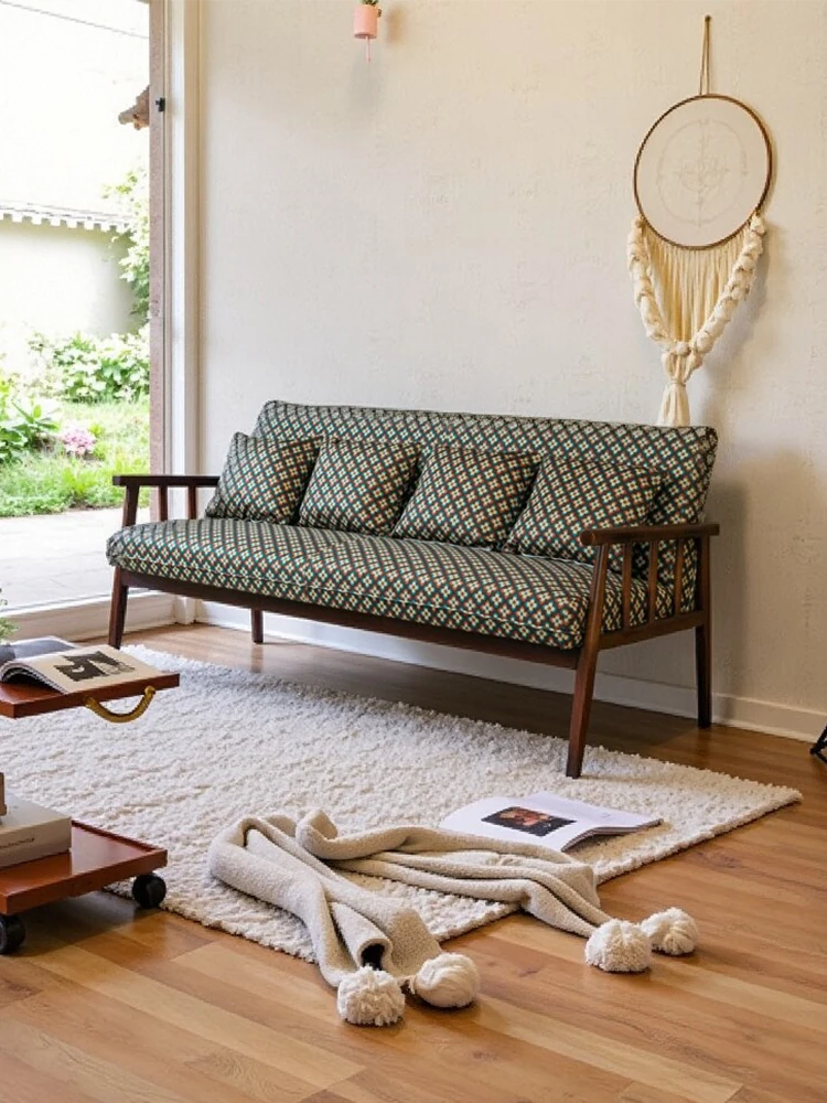 フレンチヴィンテージスタイルの無垢材ソファ|全て無垢材使用の3人掛け|小型住宅にぴったりなアメリカンアンティーク風ファブリックソファ|おしゃれで温かみのある空間を演出!