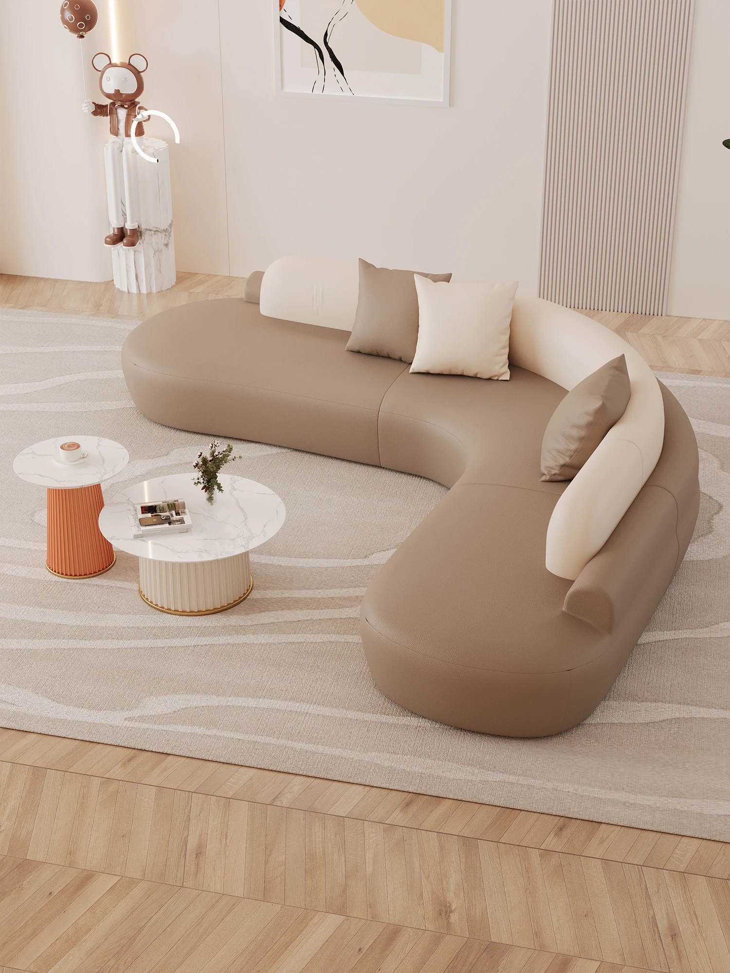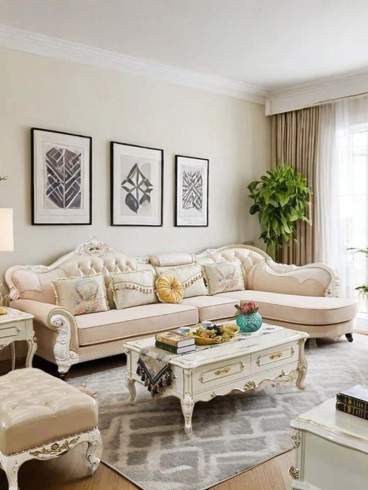クリーム風のリビングルームにぴったりのラグジュアリーL字型コーナーソファ - 美容院や販売所の待合スペースに最適!快適な休憩とお洒落な会話を楽しめる空間を演出します。