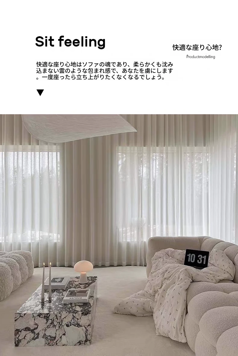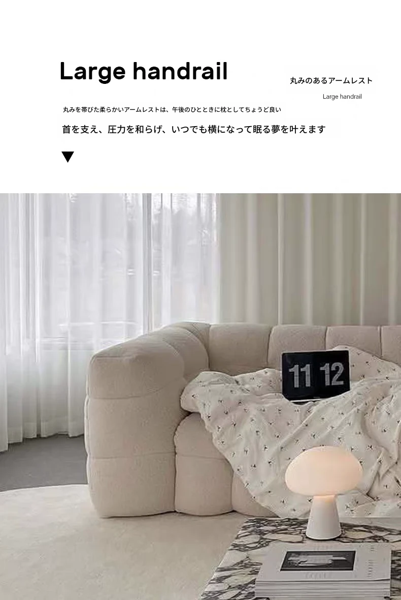 フランス風クリームコットンマシュマロファブリックソファ - シンプルでおしゃれ、小型リビングにぴったりな3人掛けロングラムソファ、ふんわりとしたラムファーが心地よい!