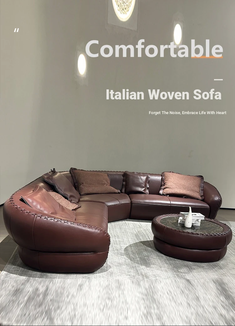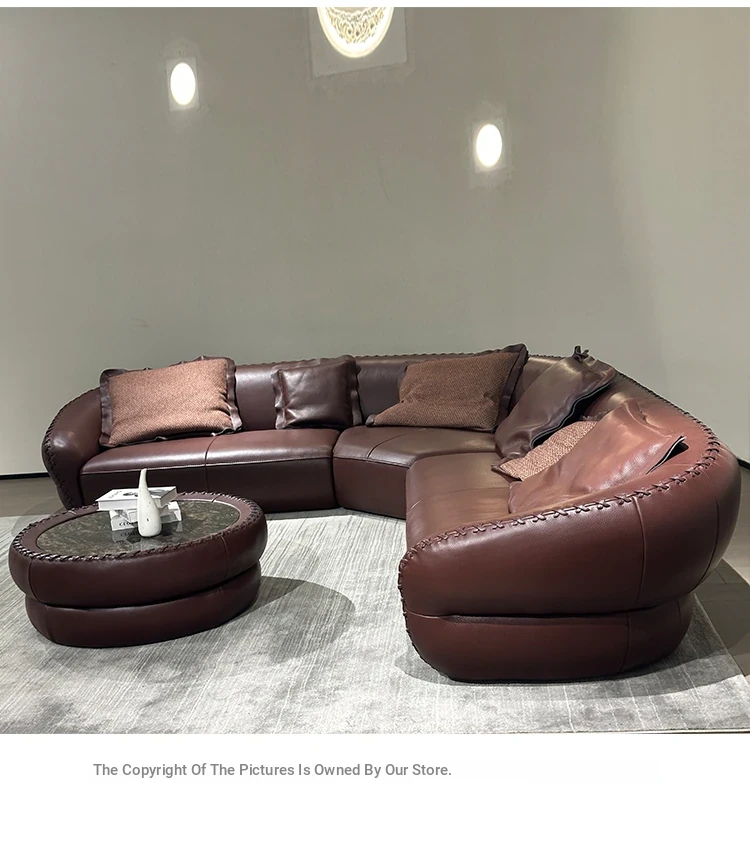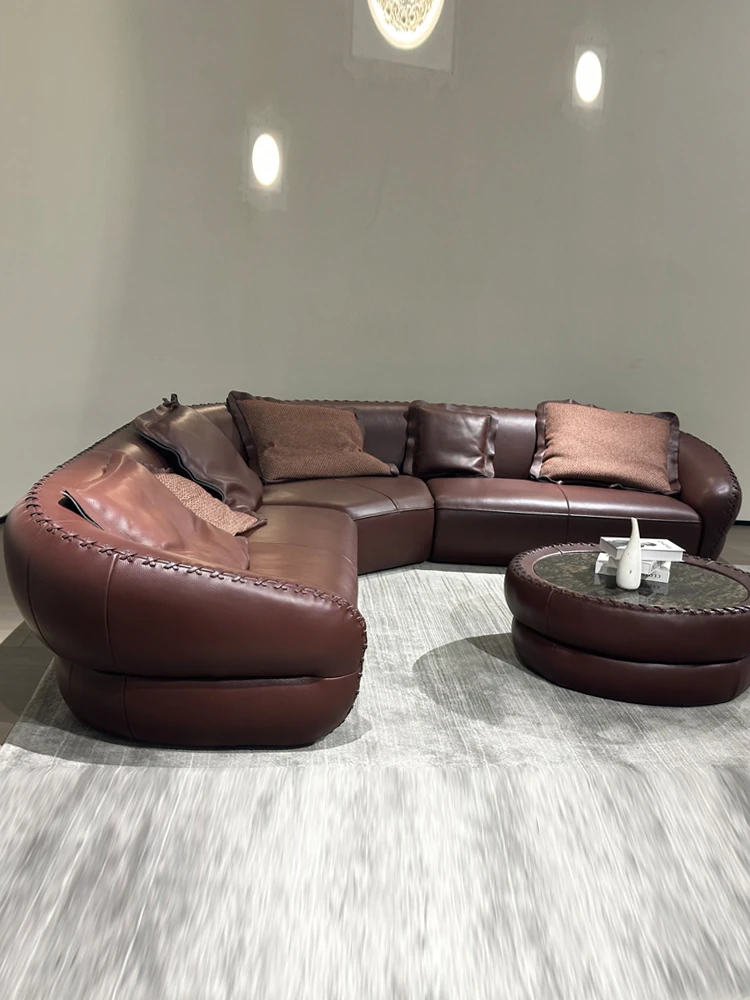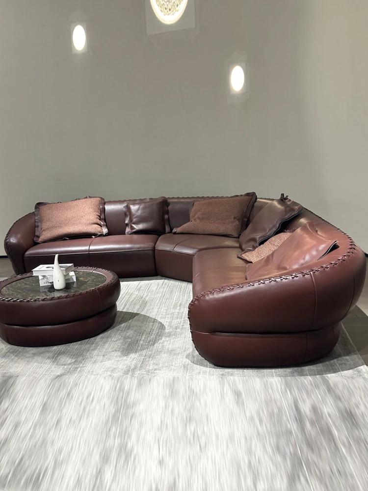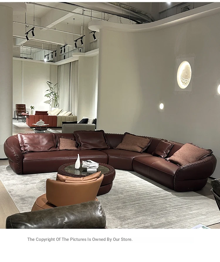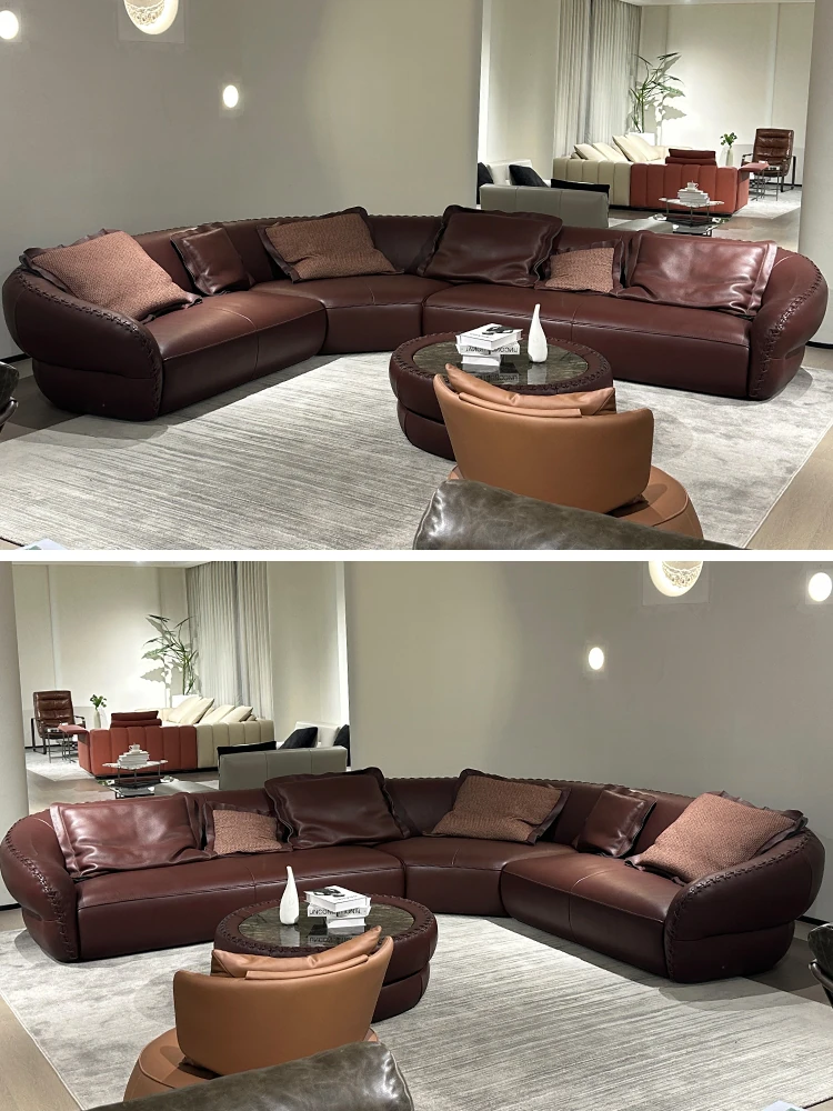Genuine Leather Italian Minimalist Curved Sofa - Luxurious Velvet Living Room Reception Sofa for Spacious Homes - Model C-050 in Elegant Red