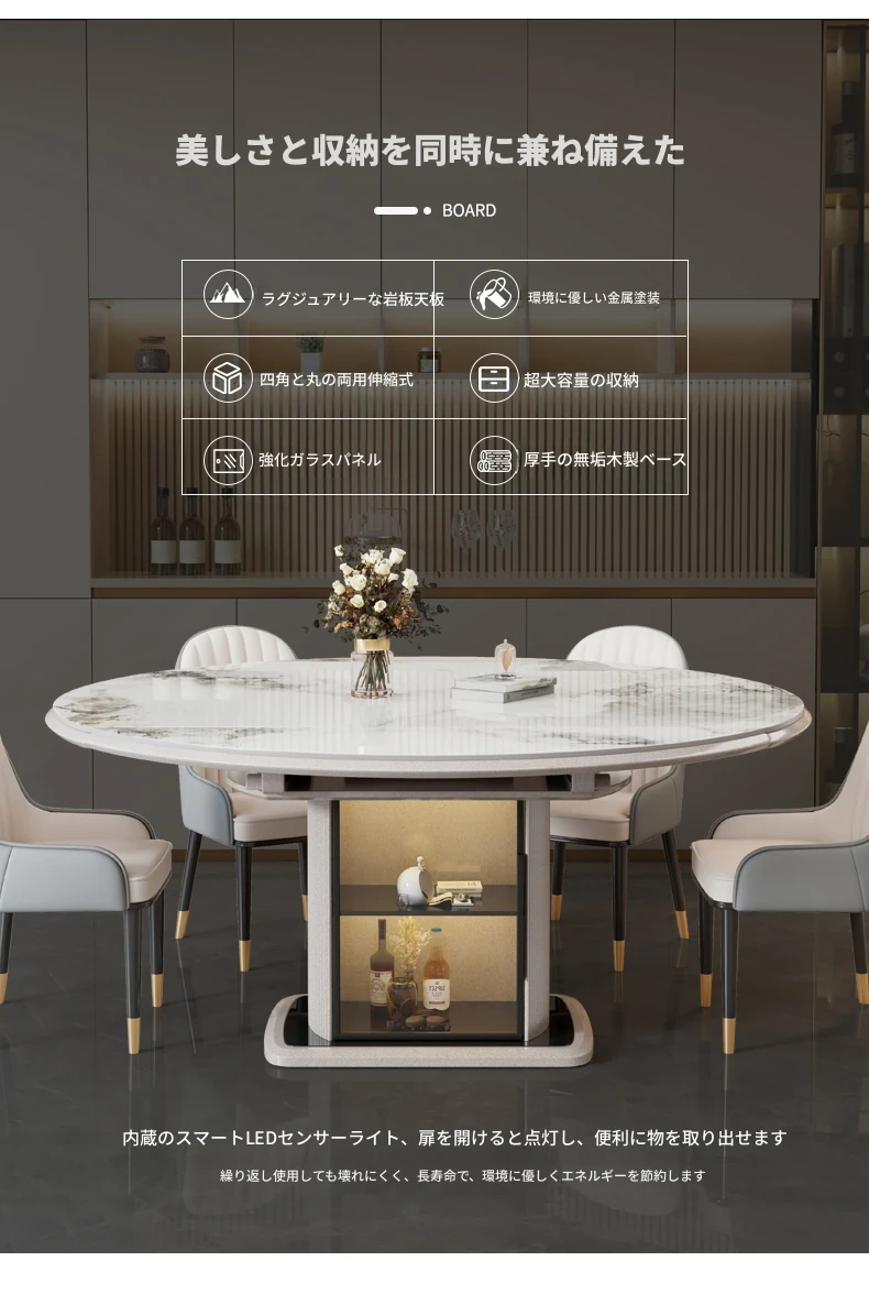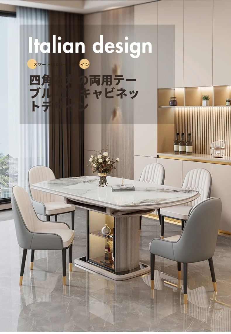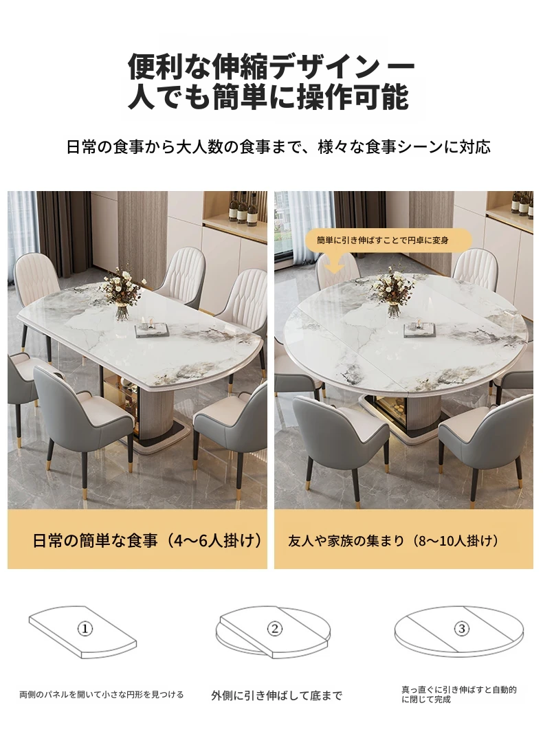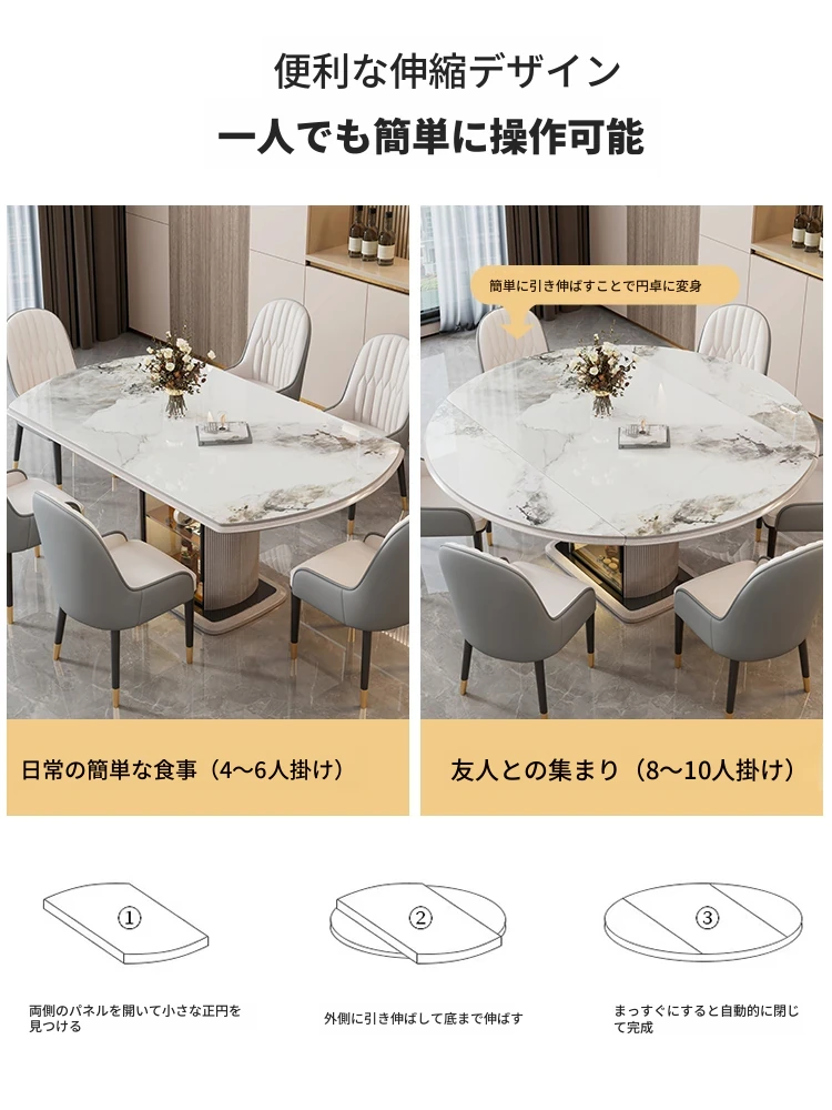伸縮可能な岩板ダイニングテーブル|四角と丸型の2WAYデザイン|折りたたみ収納機能付き|モダンでシンプルな軽奢スタイル|小さなスペースにもぴったり!