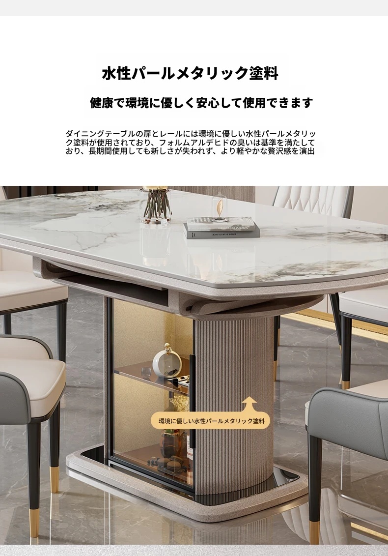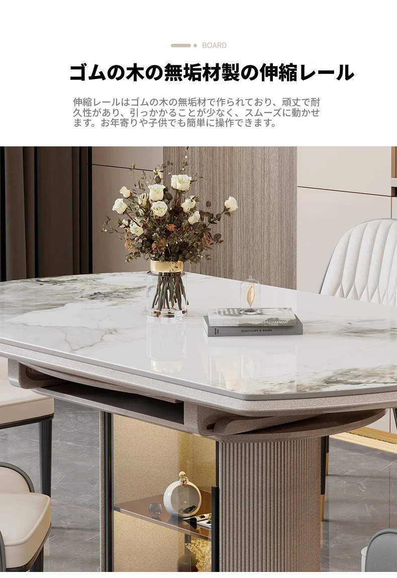 1.5メートル伸縮収納ダイニングテーブル+6脚【電磁調理器タイプ】 厚さ12MMの岩板