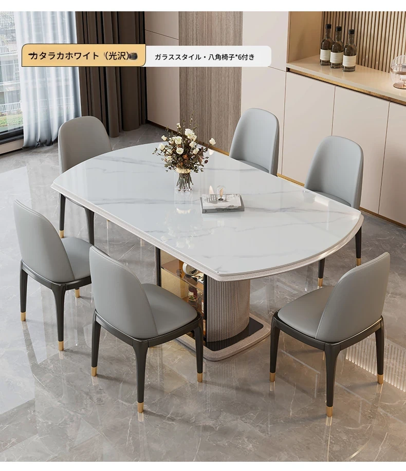 1.2メートル伸縮収納ダイニングテーブル+6脚【電磁調理器タイプ】 厚さ12MMの岩板