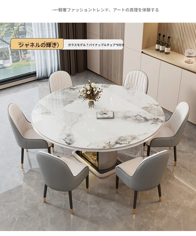 1.2メートル伸縮収納ダイニングテーブル+6脚 厚さ12MMの岩板