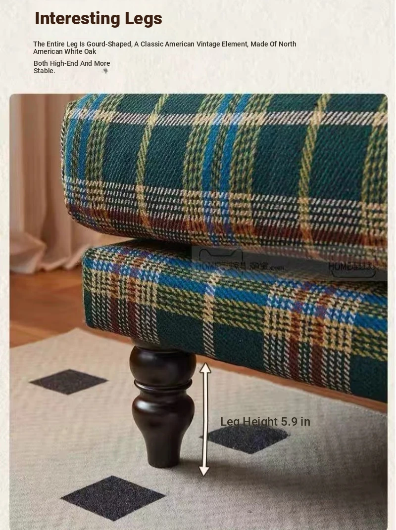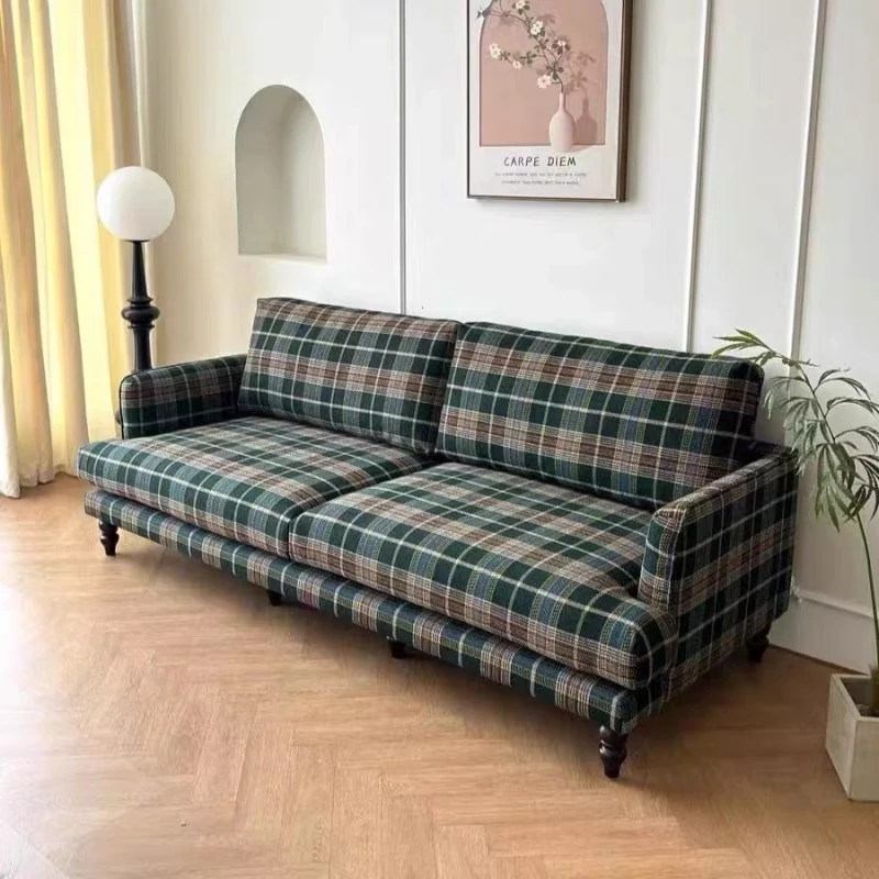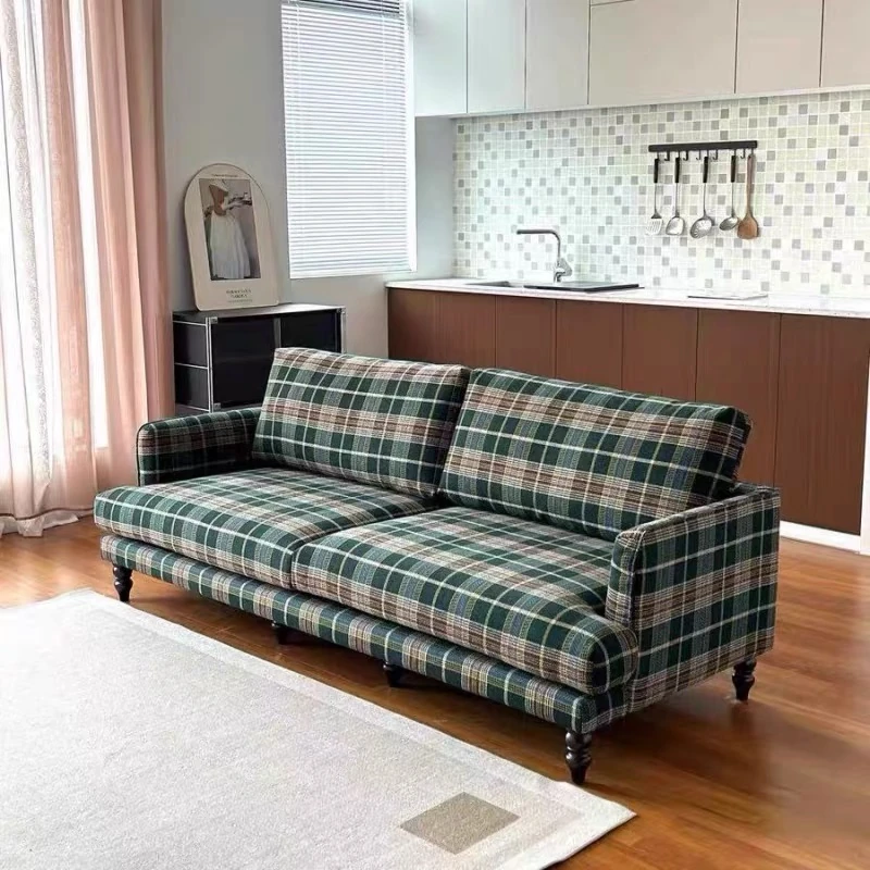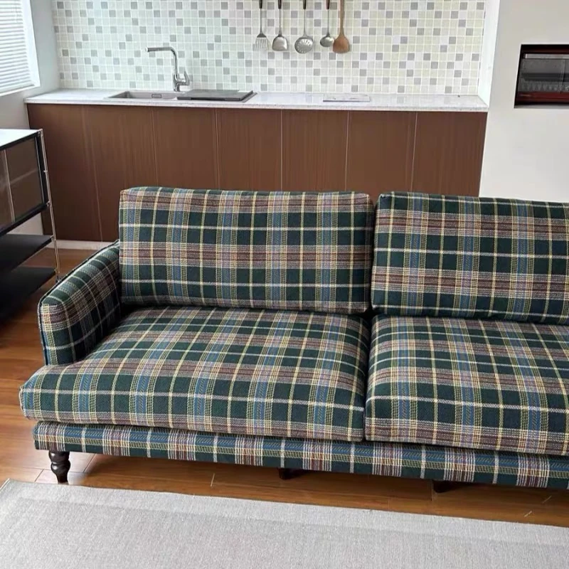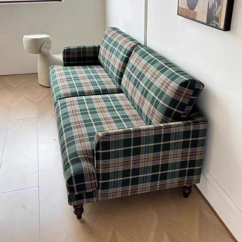 Vintage Green Plaid Sofa - American Style Fabric Couch for Living Room, Ideal for Small Apartments and Guesthouses, Cozy Two-Seater Design